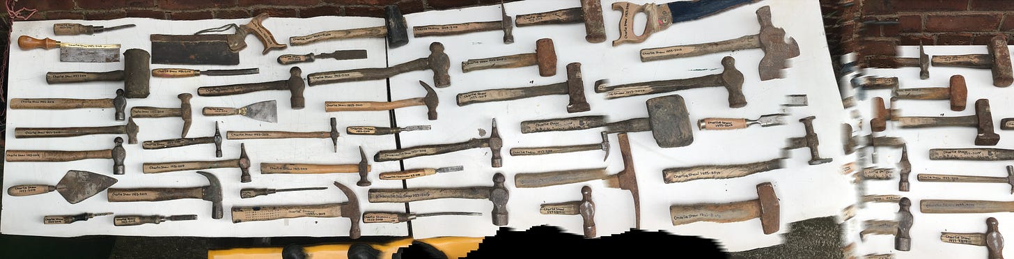 Judy’s dad, Charlie was a mechanic. He had worked on bicycles and cars in his long career, before becoming an odd job man in his retirement, and doing a lot of work in wood. His house was absolutely packed with all manner of tools. He must have had literally dozens of screwdrivers, and saws, and hammers, and chisels, and thousands of screws and nails, and stacks of wood. Some of those too have found their way into my tool hoard, but only a small portion of them. There were so many that, for his funeral we selected a large amount of the ones with wooden handles and inscribed his name and dates on them, and left them out on a table in his garden for guests at his wake to take home.